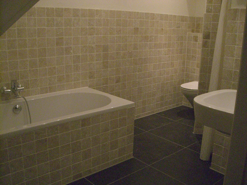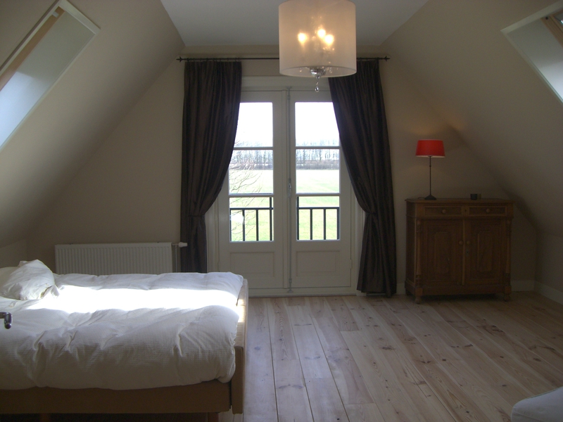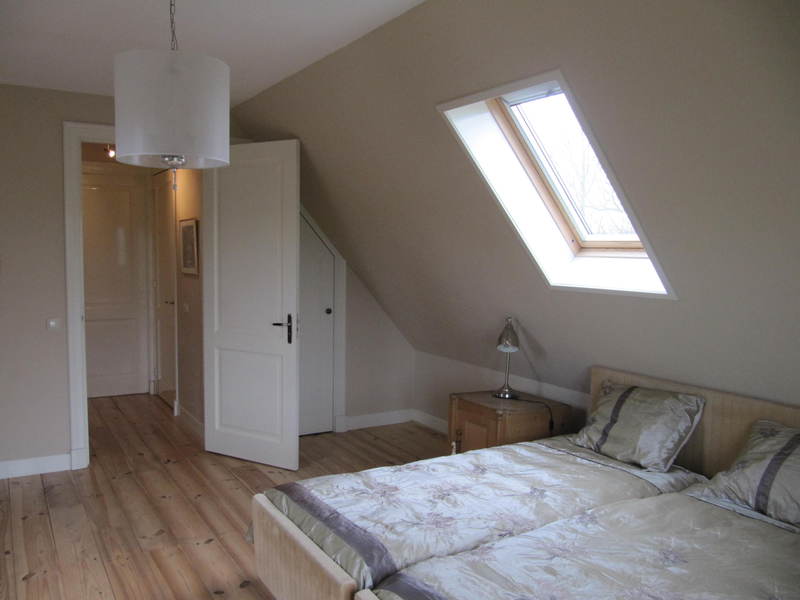 Via de trap in de hal ga je naar de verdieping met één enorme slaapkamer en een kleinere kamer, elk met twee eenpersoonsbedden. Hier is ook een tweede luxe badkamer met douche, ligbad en wc.