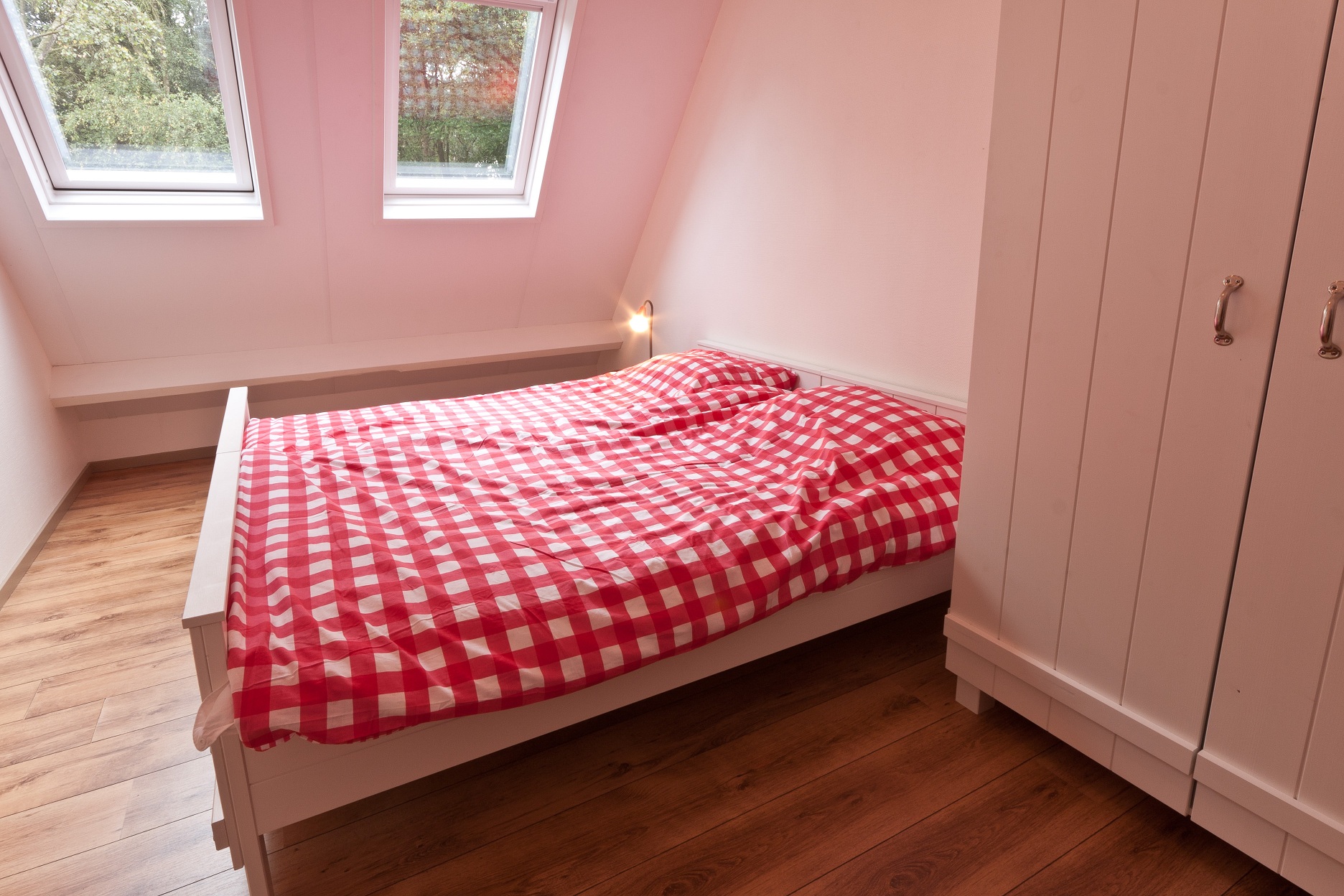 Boven bevinden zich 2 ruime slaapkamers waarvan 1 met een lits-jumeaux en 1 met 2 1-persoons bedden. Hier is ook de badkamer met een regendouche en een badmeubel. Via de openslaande deuren loopt u zo het terras op, maar wanneer u heerlijk relaxen wilt in het gras is dit geen enkel probleem. De konijnen, fazanten en eekhoorns kunt u er ook aanschouwen.