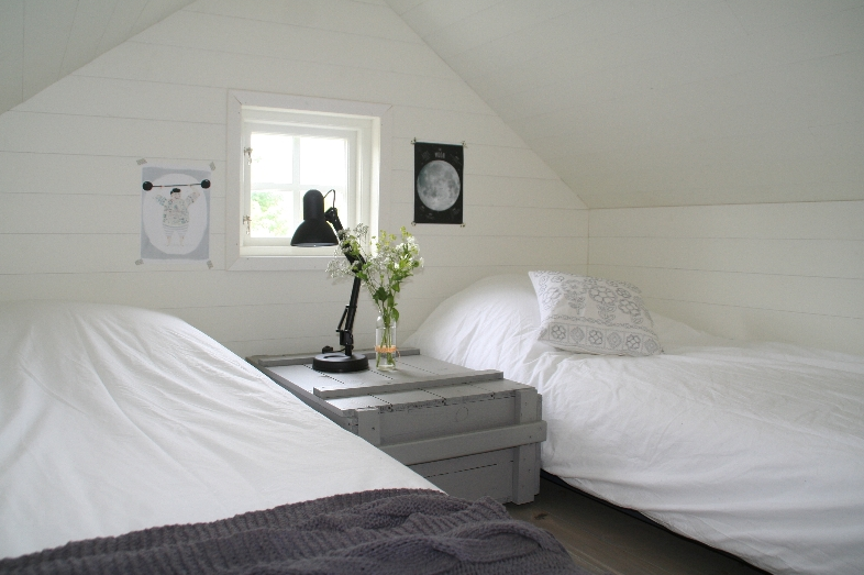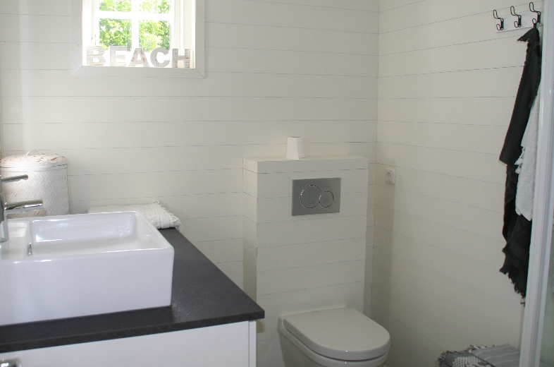 Op de benedenverdieping is verder een tweepersoons slaapkamer met boxspring bedden. Tot slot een badkamer met toilet, wastafel, douche en wasmachine. Aan weerszijden van het huisje is een gezellige slaapvliering met aan de ene kant twee losse eenpersoons bedden en aan de andere kant een tweepersoonsbed. Beide slaapzolders zijn bereikbaar via een solide trap en grotendeels afgeschermd met een balustrade.