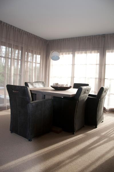 Aan de achterkant van het huis, in de serre, bevindt zich de woonkamer. Doordat de serre volledige is omsloten door ramen, heeft u een prachtig uitzicht op de tuin en de omliggende landerijen. Hier kunt u als de kinderen in de tuin aan het spelen zijn lekker een boekje lezen.
