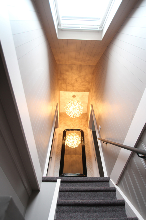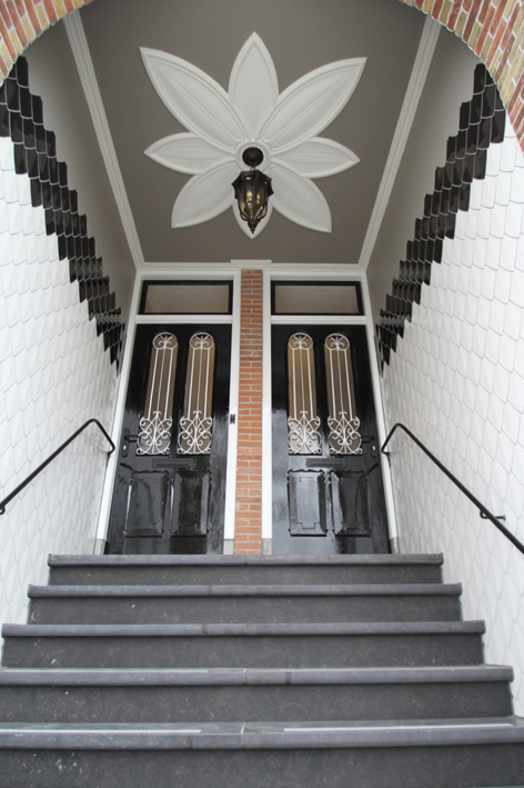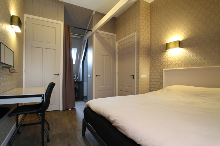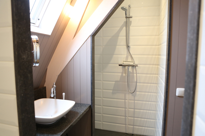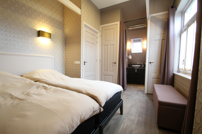 De deur met het geëtste glasraam geeft toegang tot de binnenhal. Hier bevindt zich de ruime garderobekast, het toilet en de wasmachineruimte. De trap leidt naar de bovenverdieping. Op deze etage zijn de twee ruime en sfeervolle slaapkamers. Eigentijds maar met een knipoog naar het verleden door de fraaie betimmering en het stijlvolle behang. De ene slaapkamer heeft 2 eenpersoonsbedden en de andere een royaal tweepersoonsbed. Elke slaapkamer heeft een eigen badkamer met douche, toilet en wastafel. Daardoor zijn deze logementen ook heel geschikt voor 2 “duo’s” die wel gezamenlijk onder één dak willen verblijven maar daarbij wel maximale privacy op prijs stellen.