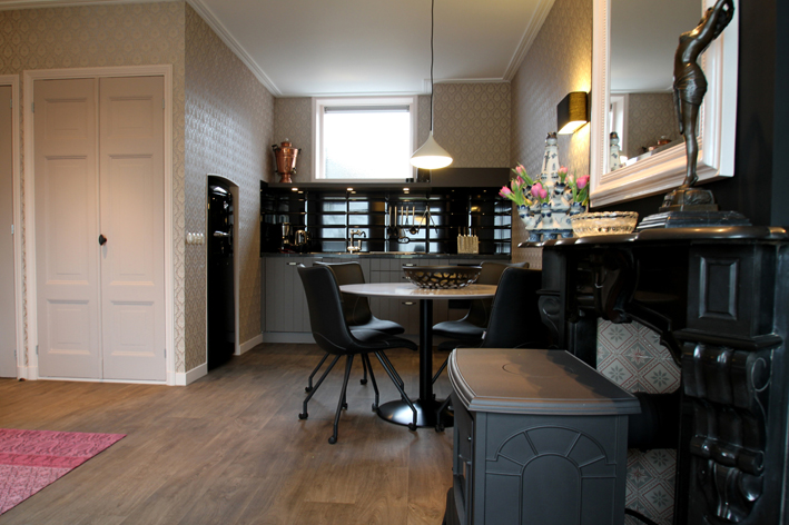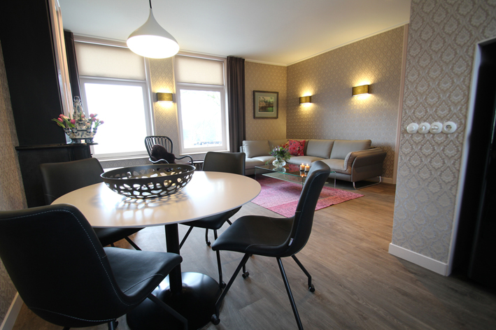 De woningen zijn nagenoeg identiek voor wat betreft de indeling en uitrusting. Op de beletage bevindt zich de fraaie woonkamer met grote ramen die veel daglicht bieden. De comfortabele loungehoek biedt meer dan voldoende ruimte om lekker te relaxen. De “retrokachel” (een nieuwe gashaard die aan alle hedendaagse veiligheidseisen voldoet) vormt een prachtig plaatje tezamen met de authentieke schouw. De ronde eettafel met comfortabele stoelen nodigt uit tot lekker lang tafelen. De compleet uitgeruste keuken heeft alles wat nodig is om zelf te koken en er is voldoende serviesgoed.